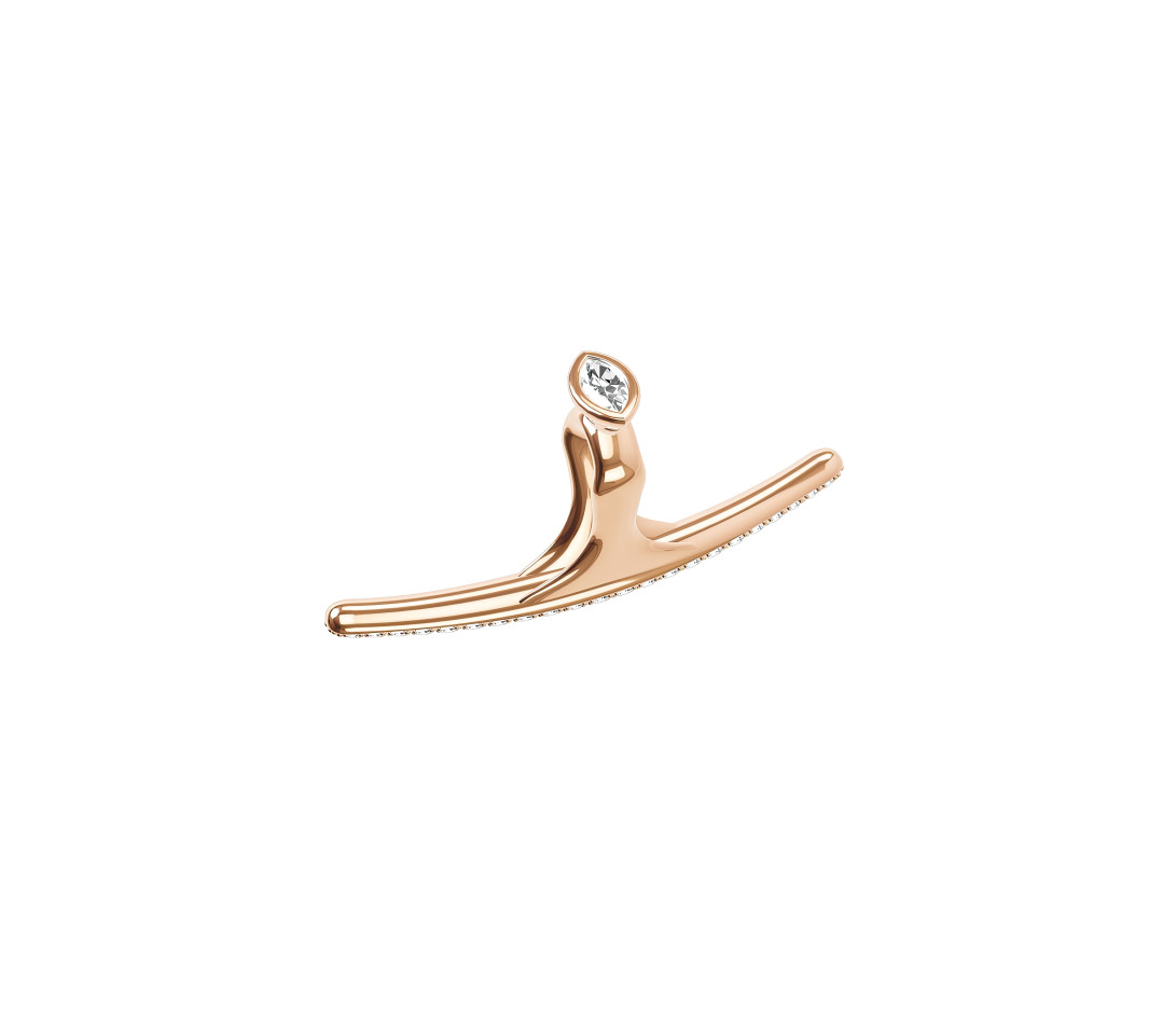 The E.T. Terra T. in rose gold is the creative component of the E.T. Terra Two-finger ring. Both avant-garde and inventive, its design echoes that of COURBET's last letter. Reversible, this part features an arched diamond-paved line with upward or downward tips, which silhouette and soft hue evoke the horizon of a planet at dawn. On the other side, an audacious marquise-cut lab-grown diamond in a bezel set recalls the shape of a shuttle and reinforces the futuristic nature of this creation, which combines delicate curves and sharp ends. The vertical bar of the T. forms a loop into which the two-finger Element can be slipped to create an interchangeable double ring. This creation in 18K recycled rose gold and lab-grown diamonds offers a particularly trendy, modern look, perfectly suited to all skin tones.