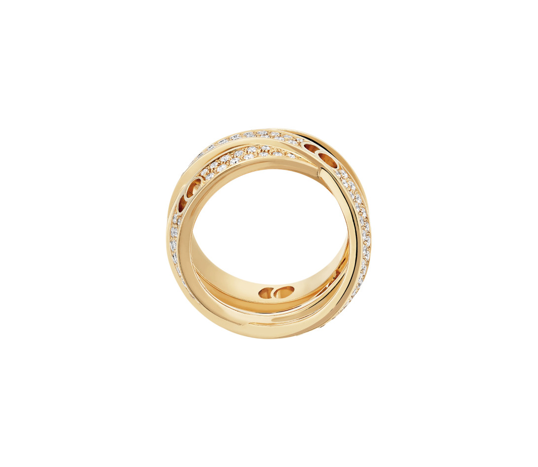 The design of the ECLIPSE Couture ring, consisting of a diamond-paved band wrapped around the finger and openworked with several motifs, offers a sense of movement that encourages the wearer to turn the jewel to appreciate its different facets. This diamond interlacing sparkles in a resolutely modern and contemporary style.
