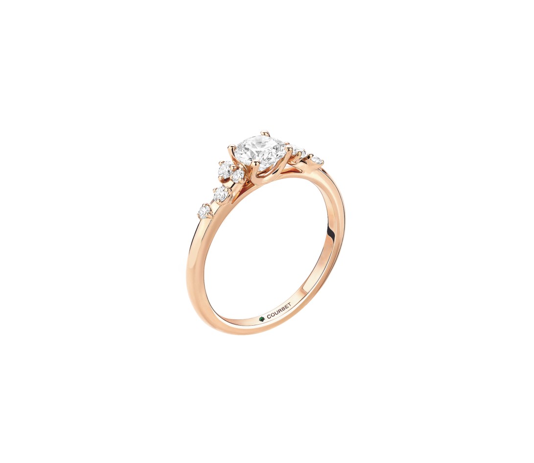 COURBET introduces a new version of the engagement ring in a bold interpretation of a great classic. Like a delicate and budding flower garden, the C de COURBET Lily engagement ring in rose gold features a creative and deliberately unique design. The brilliant-cut central diamond of 0.4 carats is surrounded by small diamonds, giving a slight asymmetry and a touch of originality to the overall look. The combination of 18K rose gold and the intense sparkle of diamonds offers a striking contrast between the warm tone of this pink colour and the whiteness of the stones. The Maison has chosen to exclusively use 18K recycled rose gold and lab-grown diamonds to adopt an ecological approach to nature preservation. A timeless solitaire that can be paired with the wedding band of your choice.